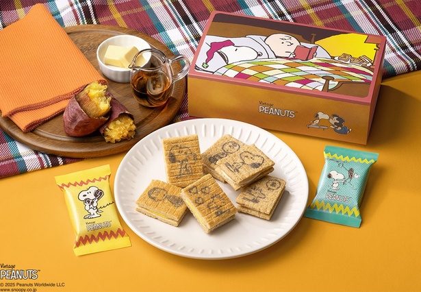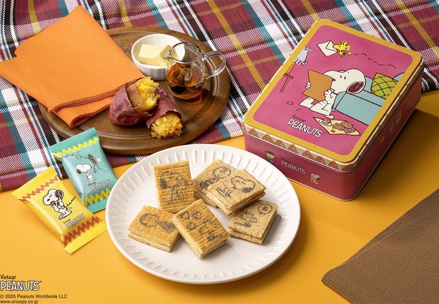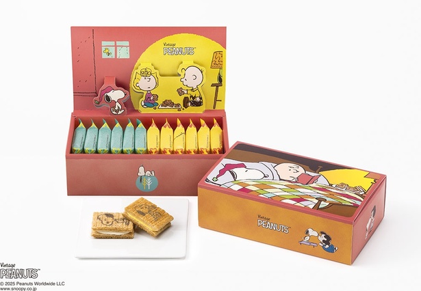 定番の「シュガーバターサンドの木」6個と、秋冬限定「蜜いもメープルバター仕立て」6個がセットに。ボックスのフタを開けると、スヌーピー、サリー、チャーリー・ブラウンが飛び出してくる仕掛けになっている。