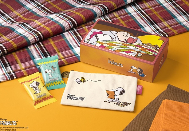 は、スヌーピーとウッドストックの刺しゅうがポイントのポーチと、12個入り詰合せがセットに。チャーム部分にさりげなくシュガーバターの木ロゴをあしらい、細部までこだわり満載!