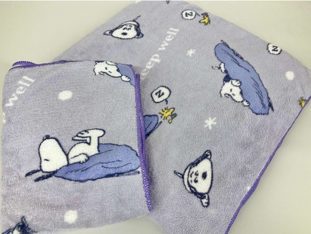は、ふわふわで吸水性抜群なクイックドライタイプ。パープルのふちどりがグレーに映えて、スヌーピー柄がよりいっそうかわいく見える。