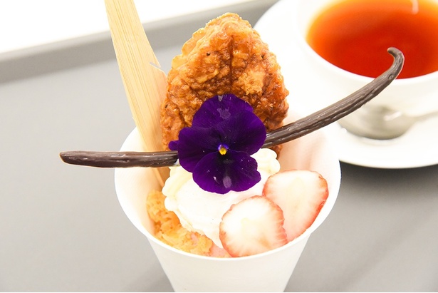 「それぞれを味わっているうちに、だんだんアイスクリームが溶けてきますから、スプーンでかき混ぜてください。バニラやいちごのジェラートと、中にカスタードクリームを忍ばせていますので、クリーム状に混ぜます。さらに、パイをくだいてジェラートやカスタードに混ぜ合わせて一緒に食べると、まるでミルフィーユを食べているような味わいが楽しめます」と、辻口シェフ。