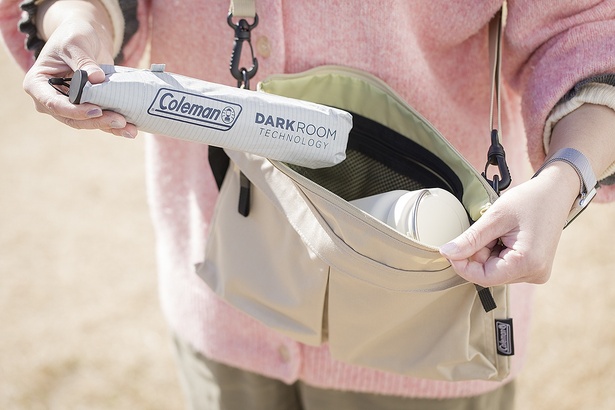 「えっ、もうできたの?(笑)」。あまりの速さに土屋が驚くと、「ホント、一瞬だね。これなら日差しが強くても安心だね」と村場も微笑んだ。このポップアップ式の軽やかさがあれば、力もいらずに準備もあっという間。広がるのと同時に、ダークルームテクノロジーが強い日光をブロック。シェードの中は、傷ませたくない食品や冷たい飲み物を守る場所にもなる。