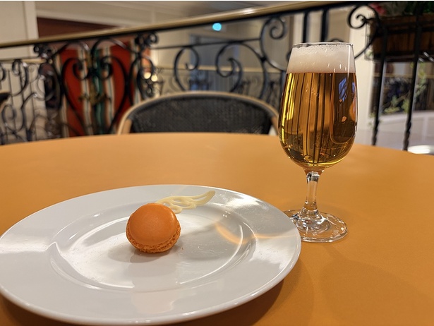続いて紹介するのは、「JAPANエール 香」と「紅茶のマカロン」の組み合わせ。実はこのビールは、今回のラインナップの中で開発担当者が「スイーツと合わせるのが一番難しかった」と語るほど、ペアリングに苦心した一杯だという。解決の糸口となったのは、このビールがお茶と非常に相性がよいという点だった。そこから着想を得て、同じ茶葉の風味を持つ「紅茶のマカロン」とのペアリングが考案されたのだという。