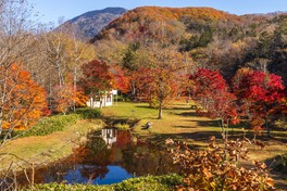 鮮やかな紅葉が映り込む静かな池と秋の空 画像提供:福原記念美術館