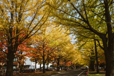 北海道大学のキャンパス内にあるイチョウ並木は、札幌を代表する紅葉スポットのひとつ。東西約380メートルにわたり70本のイチョウが立ち並び、10月下旬から11月上旬にかけて黄金色のトンネルが広がる。陽光に透ける鮮やかな黄葉が見事で、落ち葉が敷き詰められた黄色い絨毯も美しい。