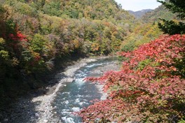 湖面に映える紅葉が美しい黄金橋付近 画像提供:日高総合支所
