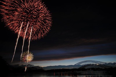 岩手県一関市川崎町で開催される東北有数の大会。雄大な北上川河畔をステージに、水中花火や2尺玉など、約1万発の多彩な花火が夏の夜空を彩る。さまざまな屋台も出店され、パフォーマンスやライブなどの催しとともに楽しめる。観覧エリア内への入場には、協力金として1人500円が必要(小学生以上)。