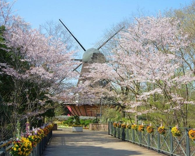 ワンパク王国ゾーンにソメイヨシノが多く植えられ、芝生広場やにじの池周辺が特に美しい。寒緋桜、河津桜、ソメイヨシノ、大島桜、山桜、しだれ桜、八重桜(開花順)など合計約800本が順次開花する。2026年3月20日(祝)~4月5日(日)の期間には、さくらまつりが開催。