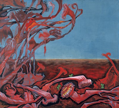 戦争の影が色濃く見られる1940年から1950年代の絵画から最新作までのさまざまな作品を通し、草間彌生の死生観が作品に与えた影響や変遷を紹介する展覧会。1970年代に制作されたコラージュや1980年代に作られた立体作品、2000年代に描かれた絵画など、展示年代を追って作品を鑑賞することで、生と死の双方の意識を持ち合わせながら創作に向かった草間の姿勢を感じることができる。