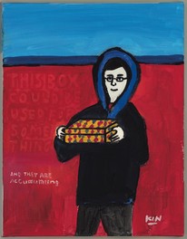 キン・シオタニ 《カラスに「バカァー、バカァー」と言われているような気がする青年》 2025年 アクリル、ペン、3号キャンバス