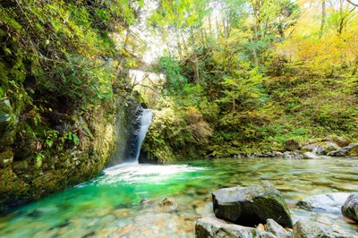 岐阜県飛騨小坂にある天然記念物「巌立(がんだて)」は、5万4000年前の御嶽山の大噴火により流れ出た溶岩でできた高さ72メートル、幅120メートルの柱状節理の大岩壁。御嶽パノラマラインから溶岩流を望むと上面が平らな緑の帯が延々と続いているのが見られ、巌立峡は「緑のグランドキャニオン」とも称されている。渓谷沿いに続く遊歩道からは、三つ滝(3段22メートル)を間近に見ることができる。秋の紅葉の時期も見応えがあり、「飛騨・美濃紅葉33選」に選ばれた紅葉の名所でもある。隆々とした岩壁と紅葉の眺めは圧巻だ。