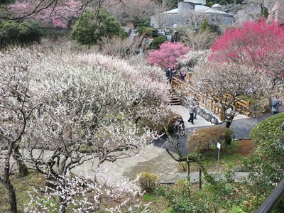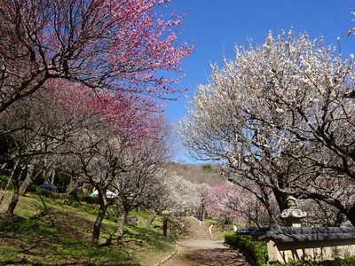白、淡いピンク、濃いピンク、紅色など多様な色の伊梅の花が早咲き、中咲き、遅咲きと順番に開花するため、長期にわたり梅の花を楽しむことができる。