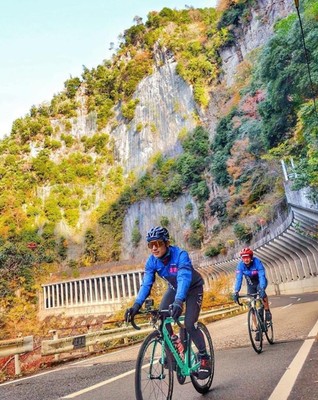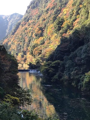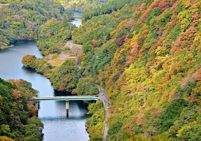 青蓮寺ダム上流から約8キロ続く斧で断ち割ったかのような柱状節理の岩壁は、ドライブコースとして人気のスポット。美しい奇岩や崖山、流れる川の渕と瀬、岩盤の川底など変化に富んだ流れ、紅葉が舞い散るさまをご覧あれ。