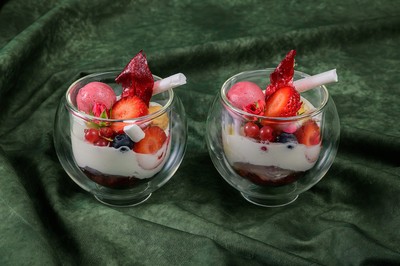 クリスマスのオーナメントを思わせるローズとベリーのパフェは、甘酸っぱいベリーにローズマリーとバラの香りを添え、フランボワーズとバニラアイスのマリアージュを楽しむことができる。