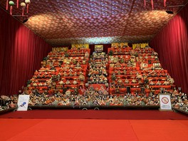 地元の中学生ボランティアの協力のもと制作された福よせ雛は、座り方や小道具など、じっくり見るとおもしろい飾り付けになっている