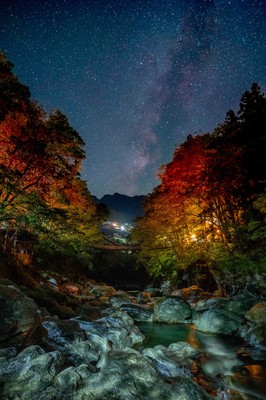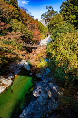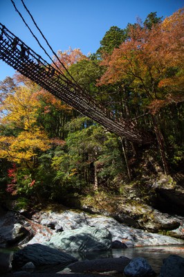 平家の落人が追手から逃れるため、切り落とせるように作られたとも伝えられている秘境・祖谷のかずら橋は、シラクチカズラ(重さ約6トン)で作られ、長さ45メートル、幅2メートル、水面からの高さが14メートルで、国指定重要有形民俗文化財である。鮮やかに色づく木々に囲まれ、かずら橋がそれらの間を繋ぎ、足元には透明な川が流れ、スリルを感じることができる。例年11月上旬から中旬にかけてが紅葉の見頃だ。
