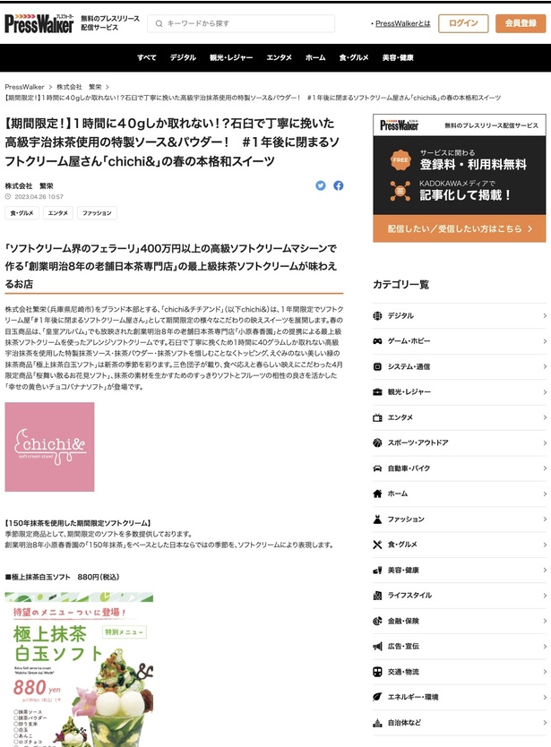 「【期間限定!】1時間に40gしか取れない!?石臼で丁寧に挽いた高級宇治抹茶使用の特製ソース&パウダー! #1年後に閉まるソフトクリーム屋さん「chichi&」の春の本格和スイーツ」