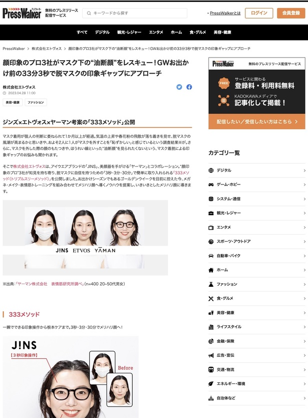 おでかけ需要が高まる社会情勢のなかで、女性のお悩みにぴったりのタイトル。「33分3秒」という具体的な時間の謎と、キーワードとして記載された「顔印象のプロ3社」のタイトルワークに興味を引かれ、プレスリリースの内容を見てみると、納得の3社によるメソッドの紹介が。「333メソッド」というネーミングも秀逸。タイトルは配信タイミングを意識して、あえて「GW」のワードが入れられていますが、これから外出も増えるであろう季節に向けて、そのまま使い回せる記事内容にもったいなさすら感じてしまうプレスリリースでした。