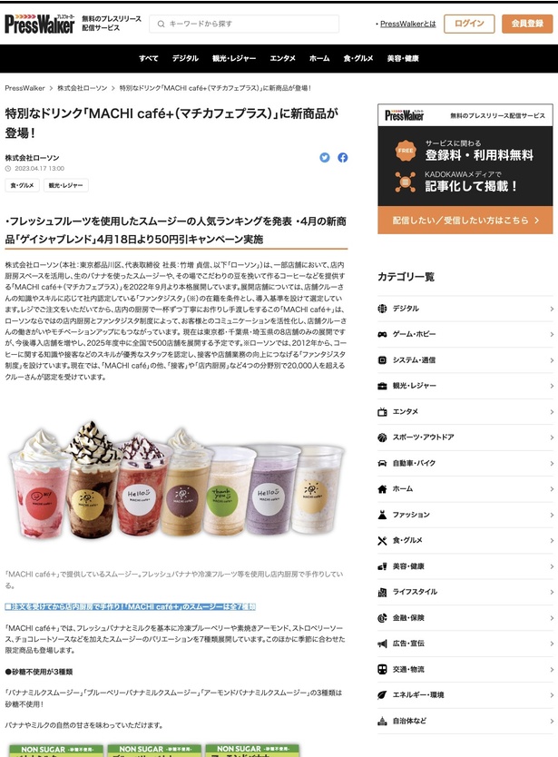 「コンビニ大手のローソンが一部店舗で展開する『MACHI cafe+』のスムージーの人気ランキング」と「『MACHI cafe+』の新商品として、エチオピア産の希少な『ゲイシャ種』を使用したコーヒー『ゲイシャブレンド』などが4月に発売された」という情報を伝える同プレスリリース。